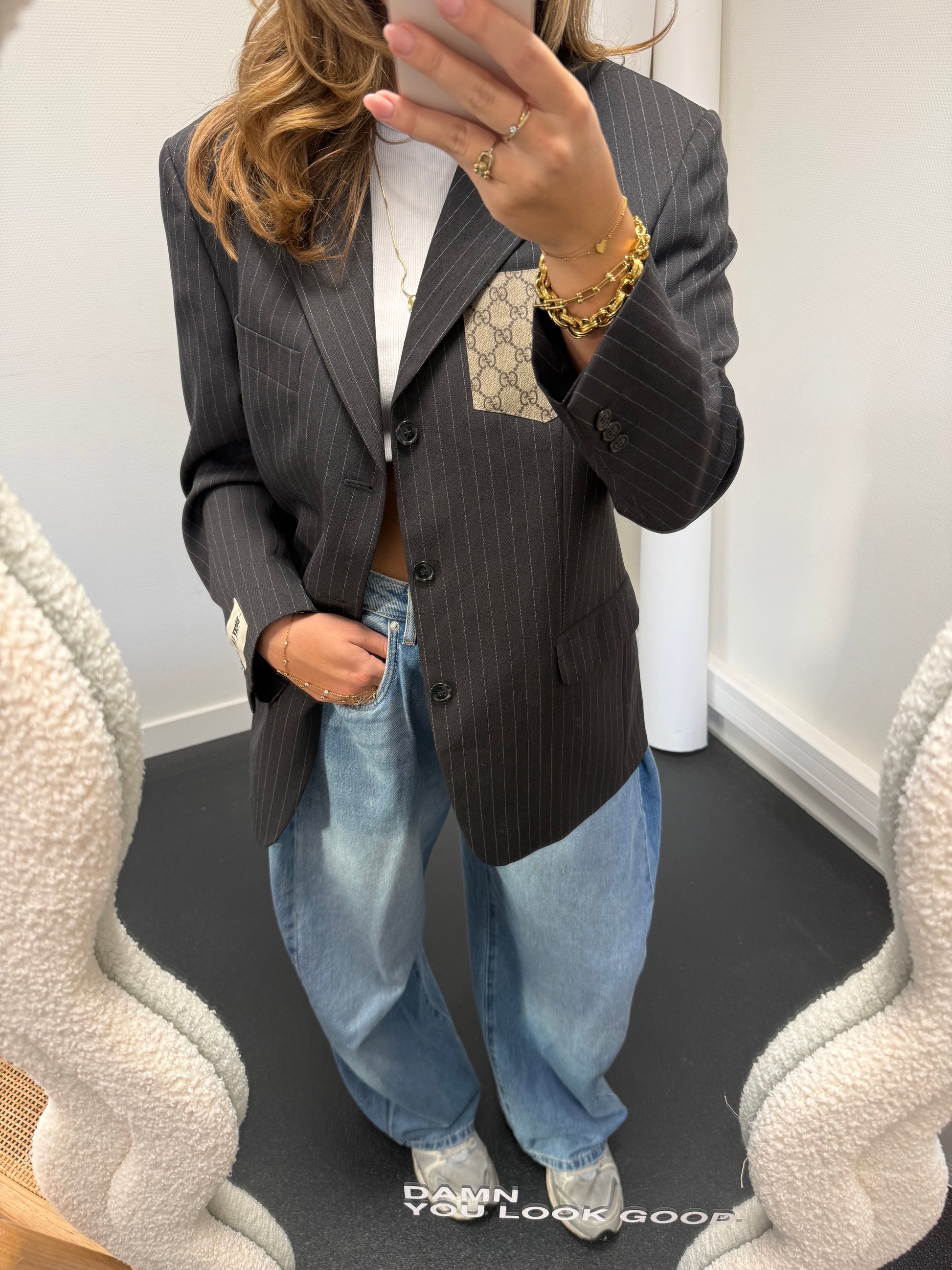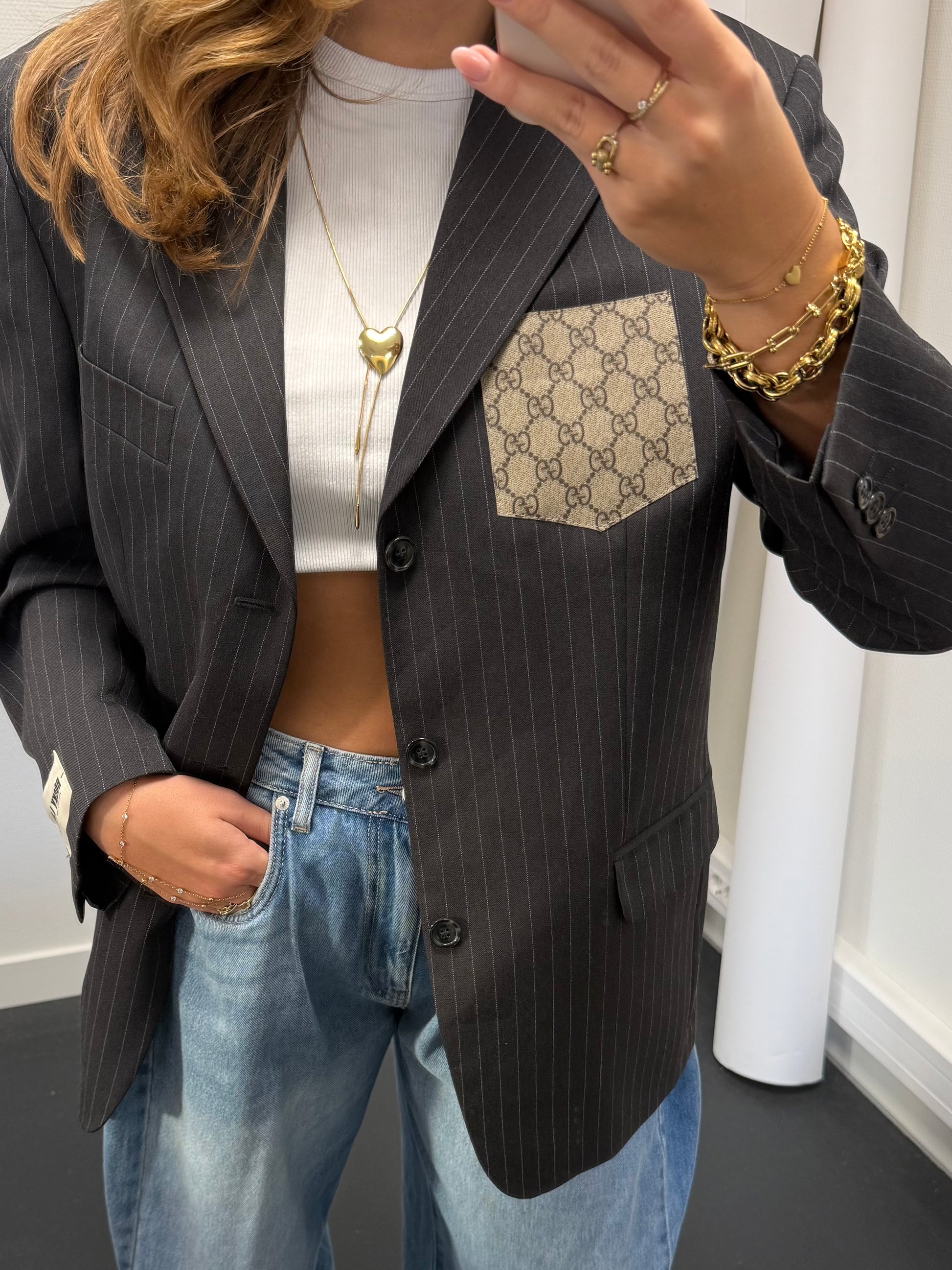This one-of-a-kind vintage designer blazer has been carefully renewed by hand, making it a unique addition to your wardrobe. With a unique designer patch and our label, it gives elegance and makes a bold statement. Whether you style it casually or dress it up, this blazer will become your your all-time favorite for sure.