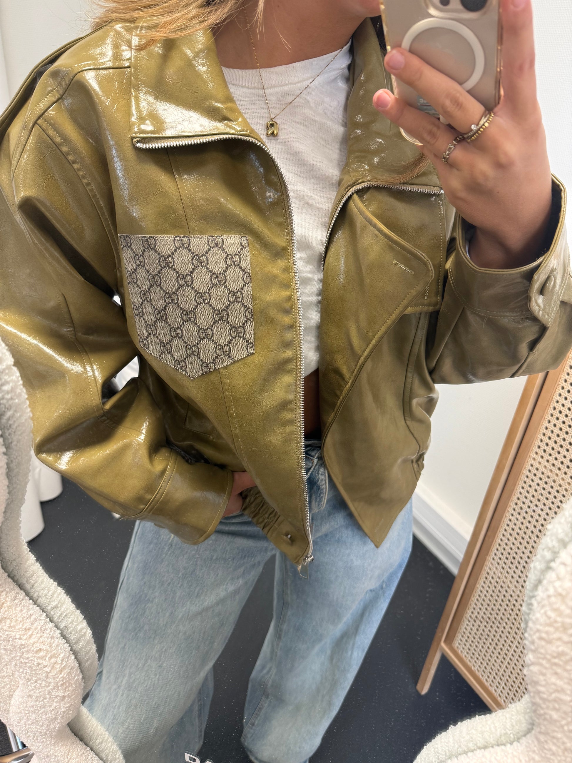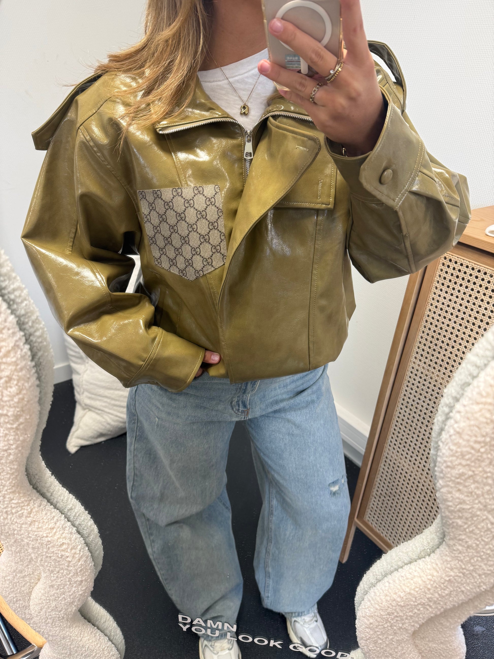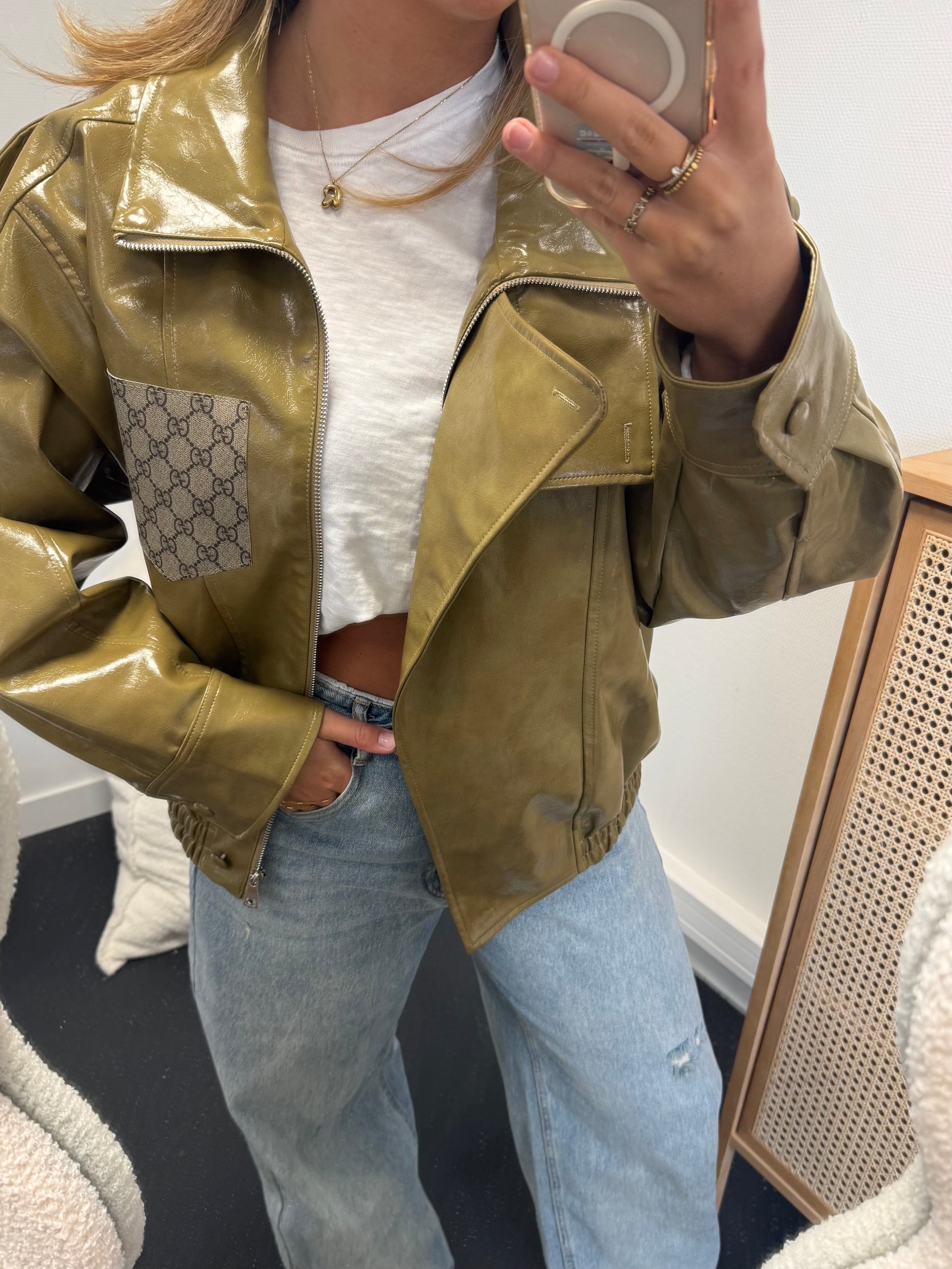 This statement patent jacket is made for those who love an edgy yet stylish look. The glossy patent finish gives the jacket instant character, while the subtle vintage designer patch on the chest adds a unique and luxurious touch. Every detail is on point, from the bold zipper to the relaxed fit.