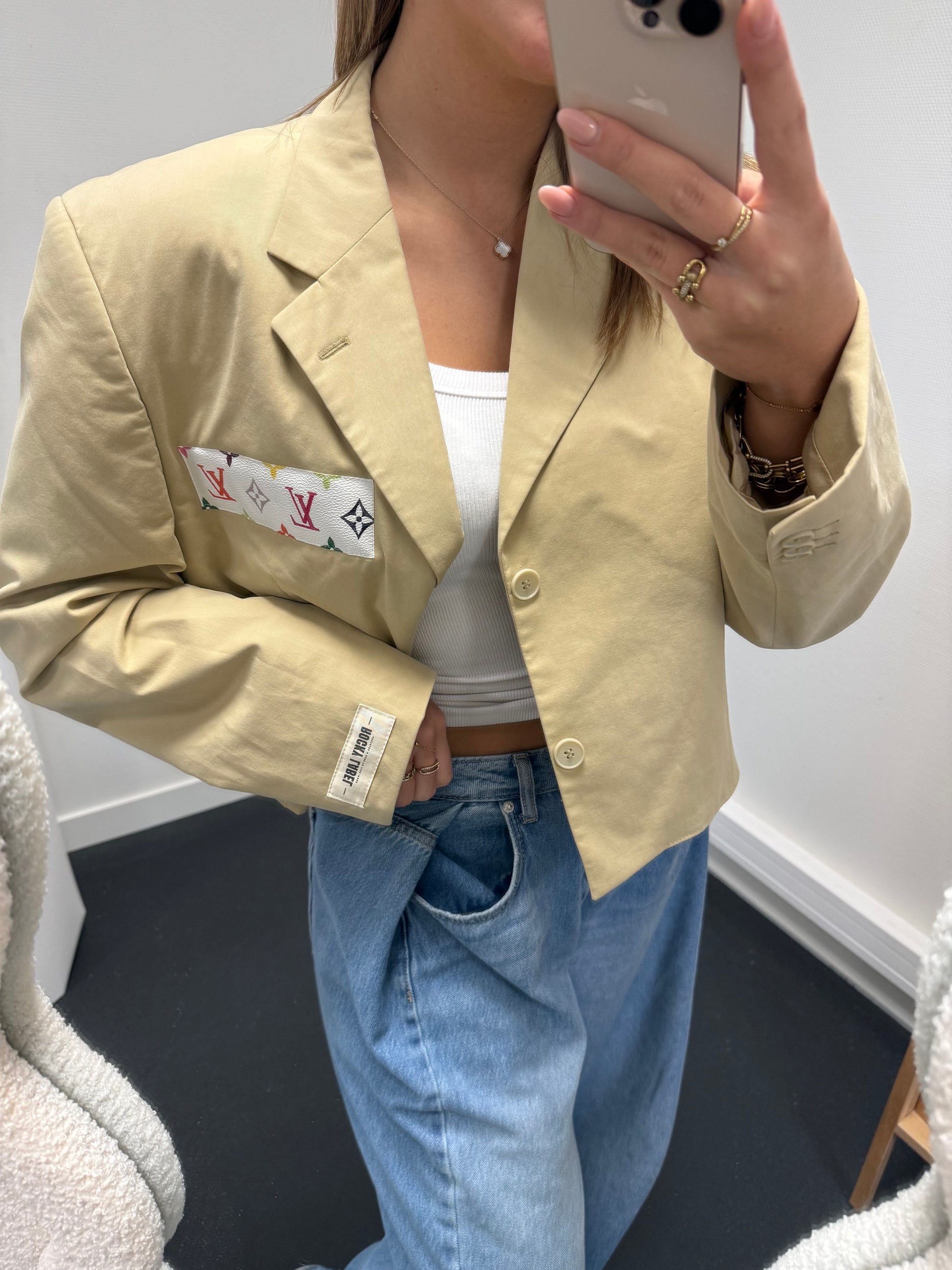 This beige cropped vintage blazer has that effortless, oversized fit, perfect for sizes L and XL. From the outside she looks flawless, but the inner lining shows visible damage and isn’t in perfect condition, which is why she comes with an extra discounted price compared to the rest.